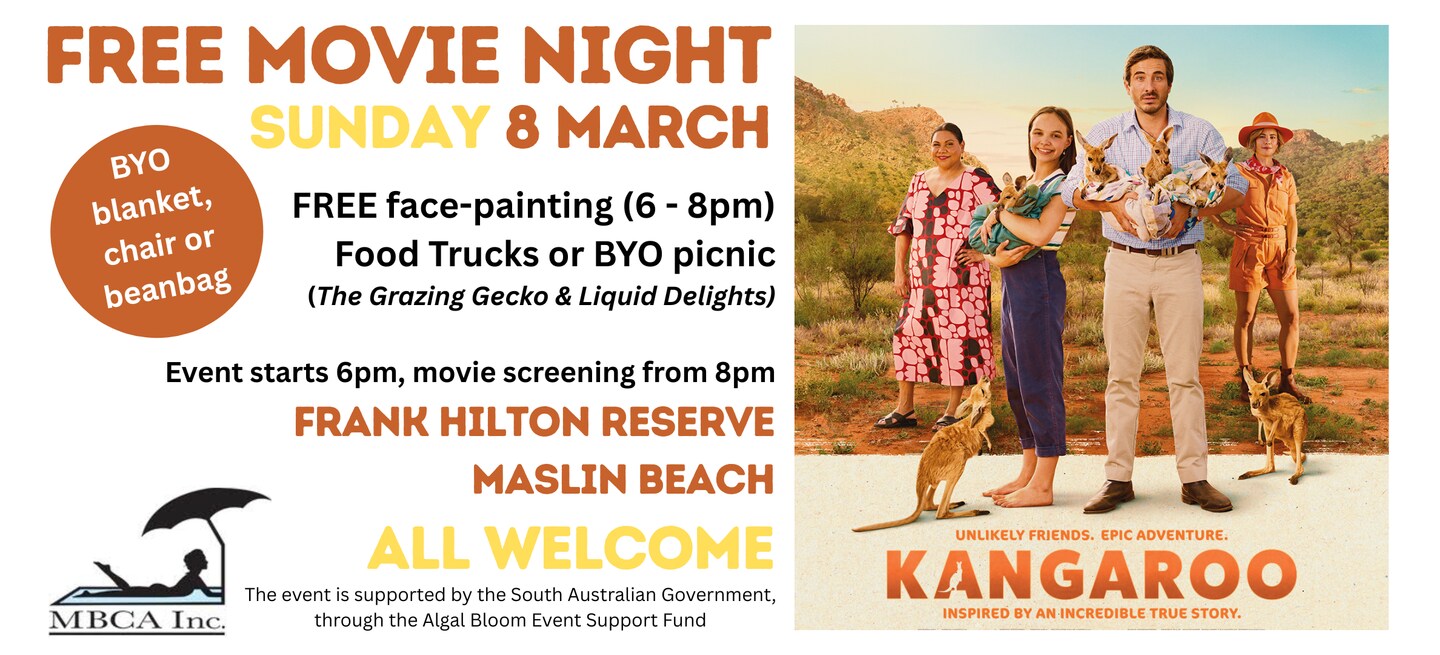 The Maslin Beach Community Association with financial support from the South Australian Government, through the Algal Bloom Event Support Fund, are holding a free movie event featuring "KANGAROO" on Sunday 8th March 2026 on our beautiful Frank Hilton Reserve.
